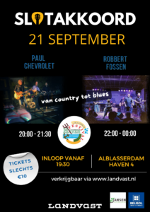Het Havenfestival Alblasserdam 2024 zal op zaterdagavond 21 september afgesloten worden met live-optredens in het Landvast Café en de Kleine zaal. Twee bands zijn geselecteerd voor een spetterend SLOTAKKOORD van het Havenfestival. Toegangskaarten zijn te koop bij de kassa van Landvast en online op www.landvast.nl.